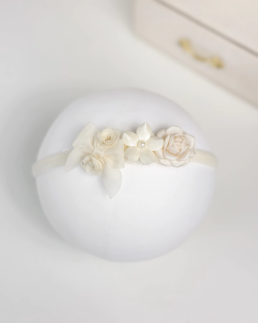 A Faixa une conforto e beleza, ideal para bebês de 0 a 2 anos. Confeccionada com meia de seda ultramacia, ela se ajusta suavemente à cabeça da criança, proporcionando bem-estar durante todo o uso. As flores de tecido e porcelana fria garantem um design único e romântico.