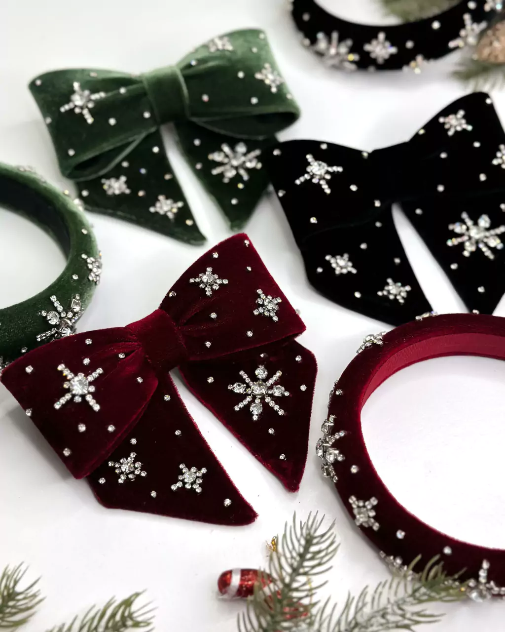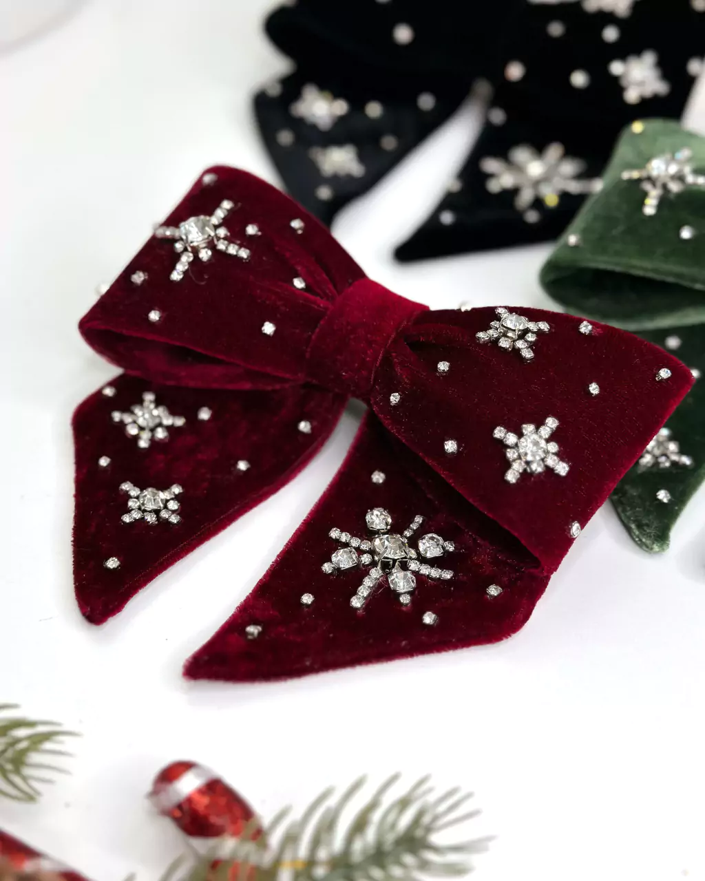 Laço inspirado na Estrela de Belém, confeccionado em tecido veludo com técnica de chapelaria para estruturar o corpo do laço, aplicações em strass, adaptado no clipe francês de 10 cm trava dupla para melhor sustentação no cabelo.
