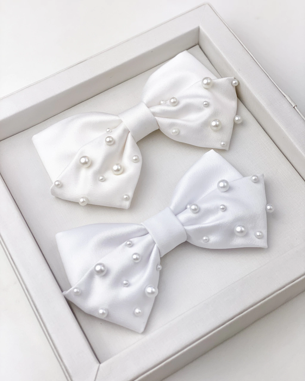Laço confeccionado em tecido levemente acetinado com aplicações em pérolas, adaptado em presilha 8cm de trava dupla.