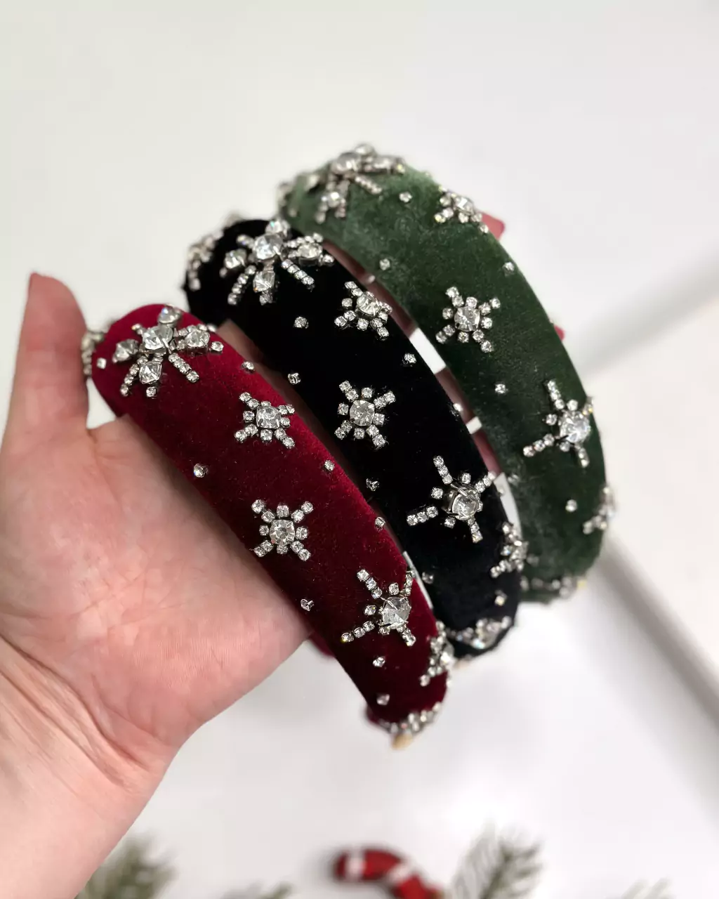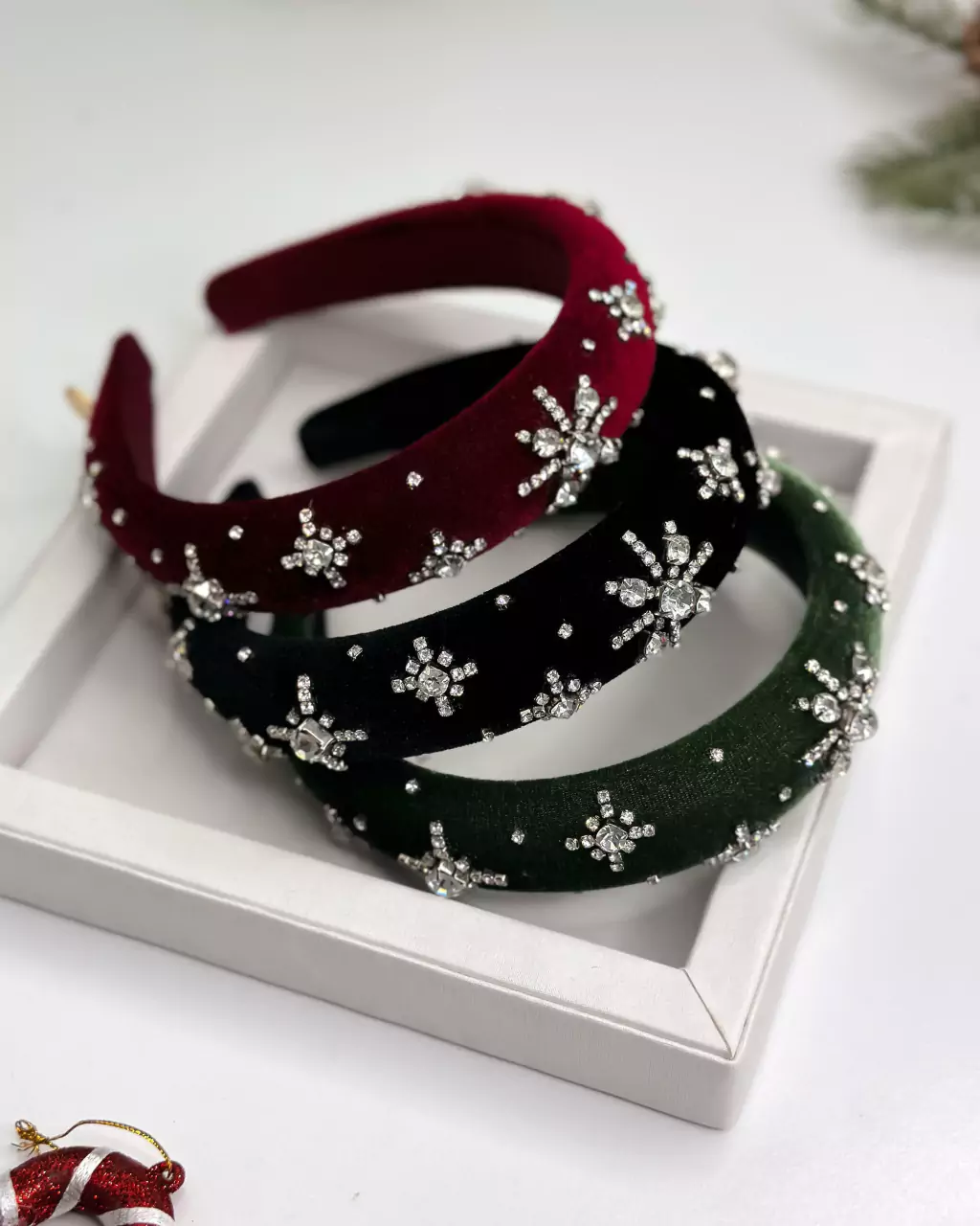 Tiara com aplicações em pedraria confeccionada em arco anatômico acolchoado encapado de veludo para maior conforto.
